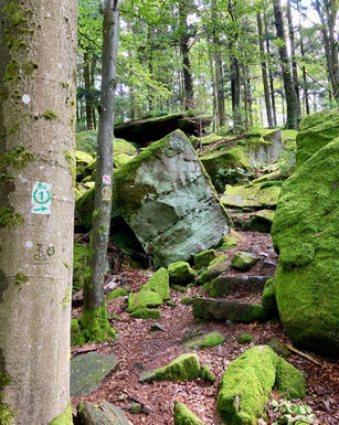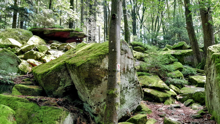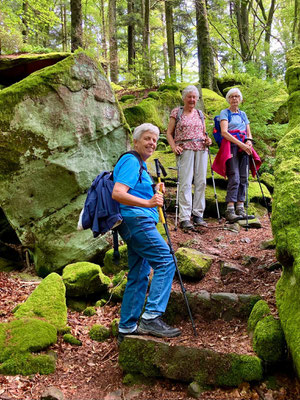 Es folgte der Burgensteig, sehr felsig und steil zum "Steinernen Gaul", einem runden Granitfelsen, dessen Form an ein liegendes Pferd erinnert. Eine sehr alte Grenzmarkierung aus dem Jahr 805.