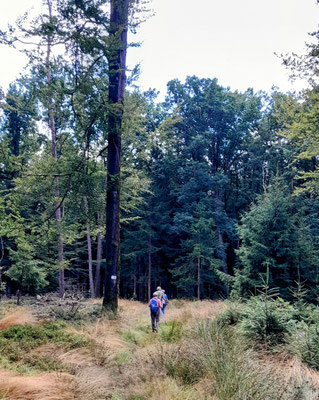 Danach verließen wir den Burgensteig und es ging sehr abwechslungsreich weiter, mal durch Wald oder freies Gelände, immer wieder mit schönen Blicken über die Hügel des Odenwaldes, bis zur Juhöhe. Nach der Mittagsrast in der Waldschenke Fuhr machten wir uns auf den Rückweg. Ständig leicht bergab führte uns der aussichtsreiche Höhenweg zwischen Juhöhe und Birkenau dem Ziel entgegen. Rechts und links des Weges die Täler mit den Orten Nieder- und Ober-Liebersbach sowie Bonsweiher und Mörlenbach.
